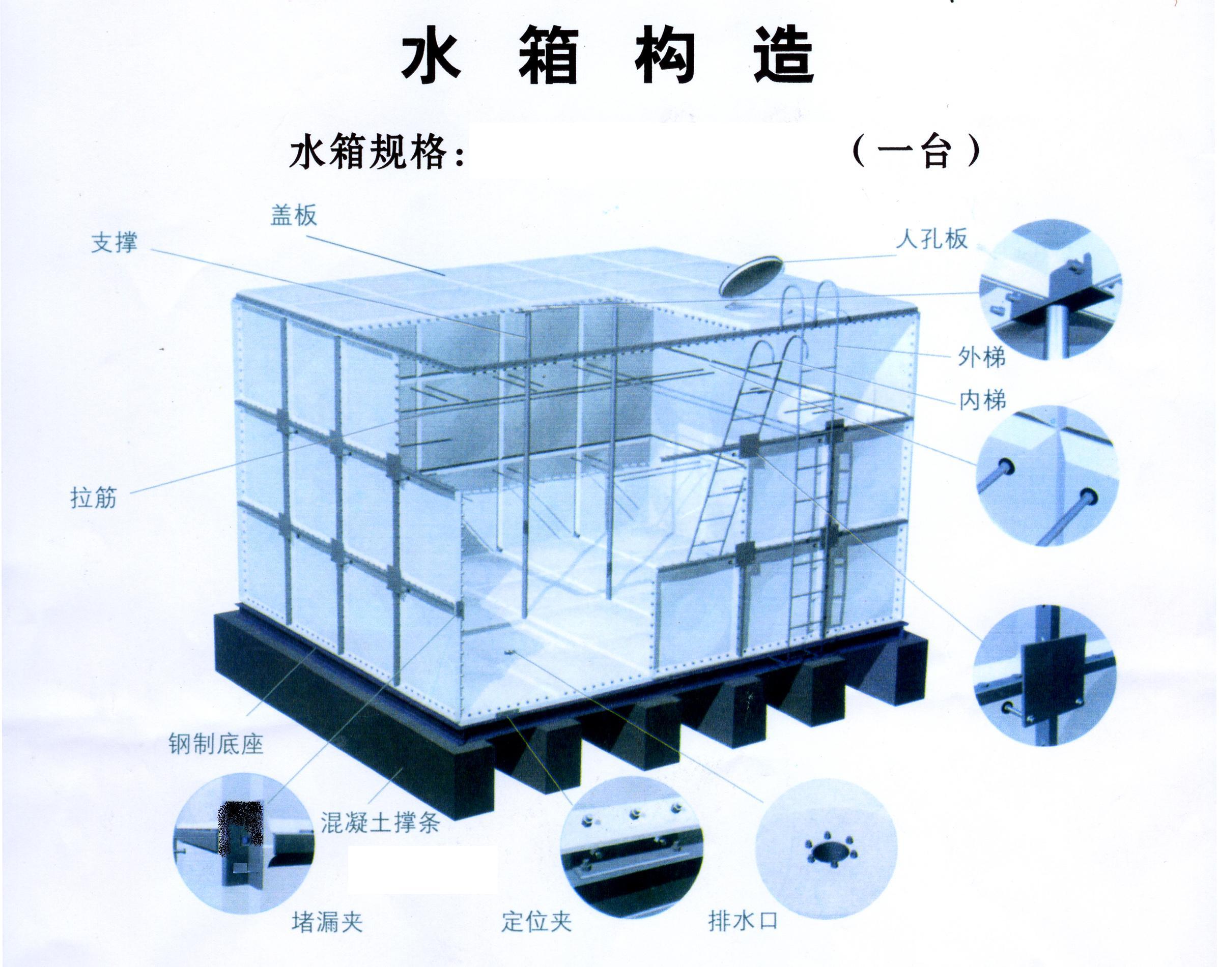 水箱按材質分為SMC玻璃鋼水箱、藍博不銹鋼水箱、不銹鋼內膽玻璃鋼水箱、海水玻璃鋼水箱、搪瓷水箱、鍍鋅鋼板水箱六種。水箱一般配有HYFI遠傳液位電動閥、HYJK型水位監控系統和HYQX-II水箱自動清洗系統以及HYZZ-2-A型水箱自潔消毒器,水箱的溢流管與水箱的排水管閥后連接并設防蟲網,水箱應有高低不同的兩個通氣管(設防蟲網),水箱設內外爬梯;水箱一般有進水管、出水管(生活出水管、消防出水管)、溢流管、排水管,水箱按照功能不同分為生活水箱、消防水箱、生產水箱、人防水箱、家用水塔五種,嚴格意義上廁所沖洗水箱和汽車水箱不屬于水箱范疇。